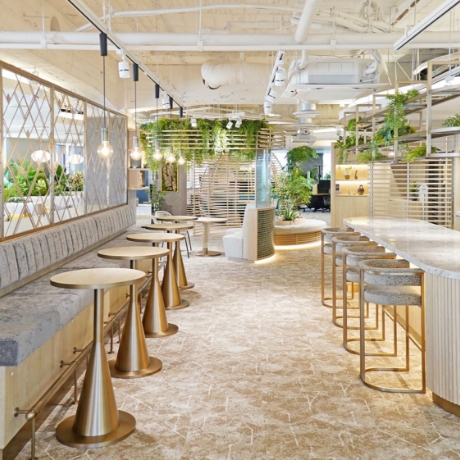 バイオフィリックデザインオフィス。創造的なアイディアや活発なコミュニケーションが求められるオフィス空間。必要充分なグリーンを設置することで、幸福度や創造性、生産性が向上するオフィス空間をご提案しています。