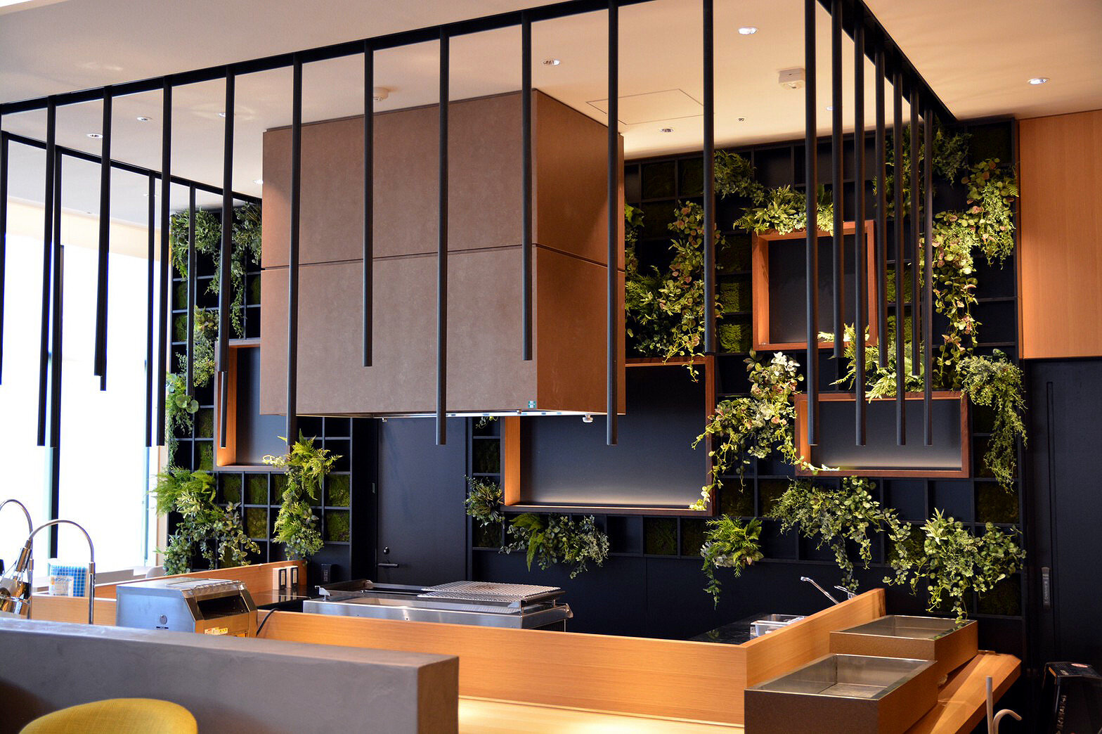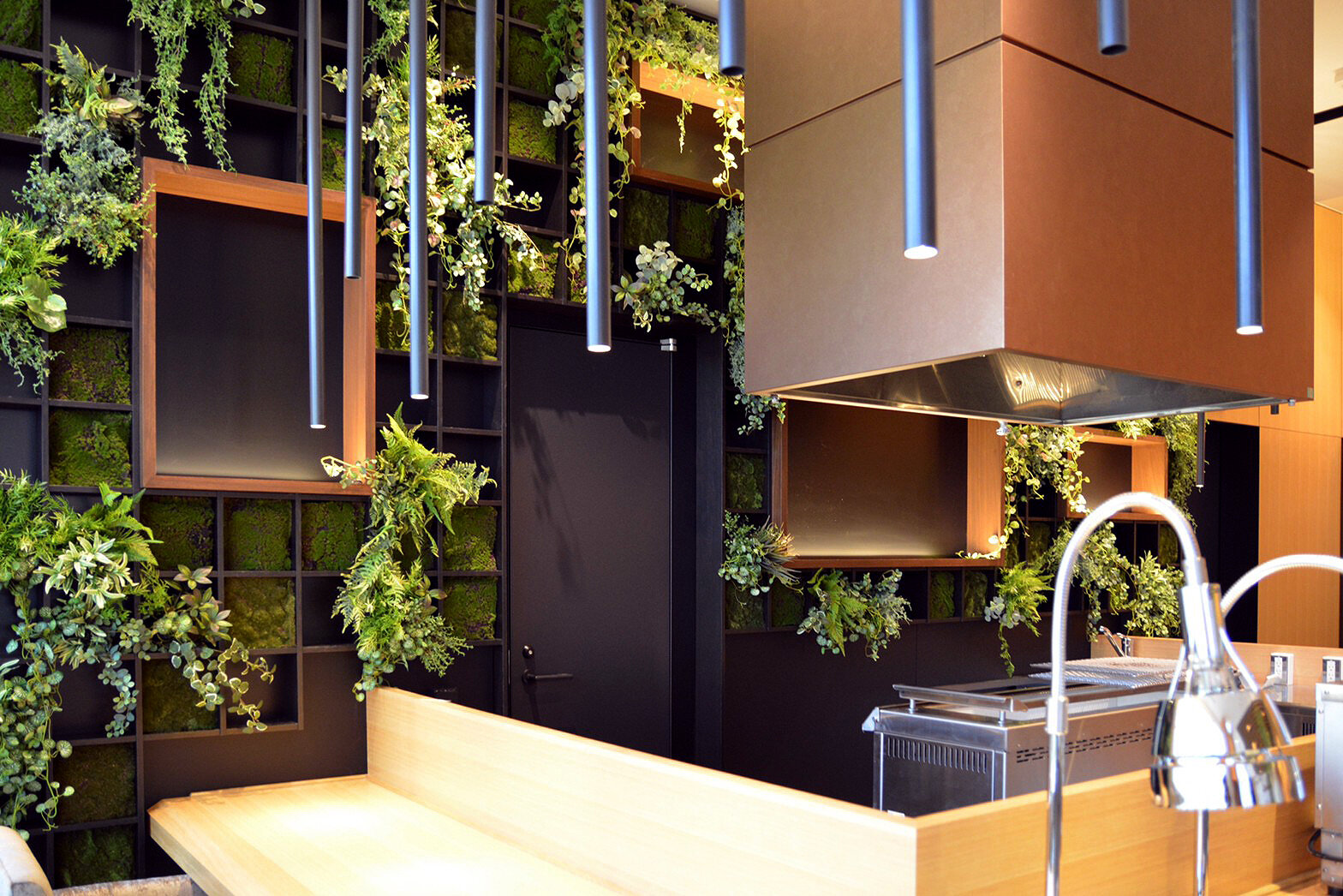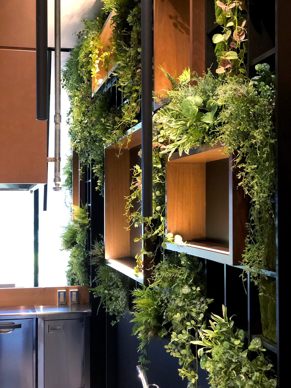 マットブラックとのコントラストが程よい、フェイクグリーンウォール 。