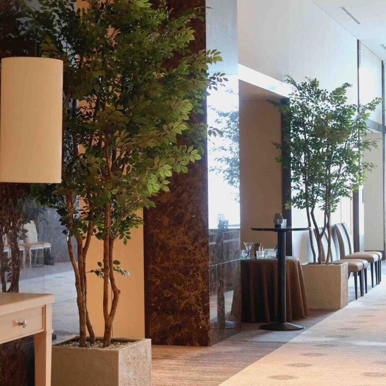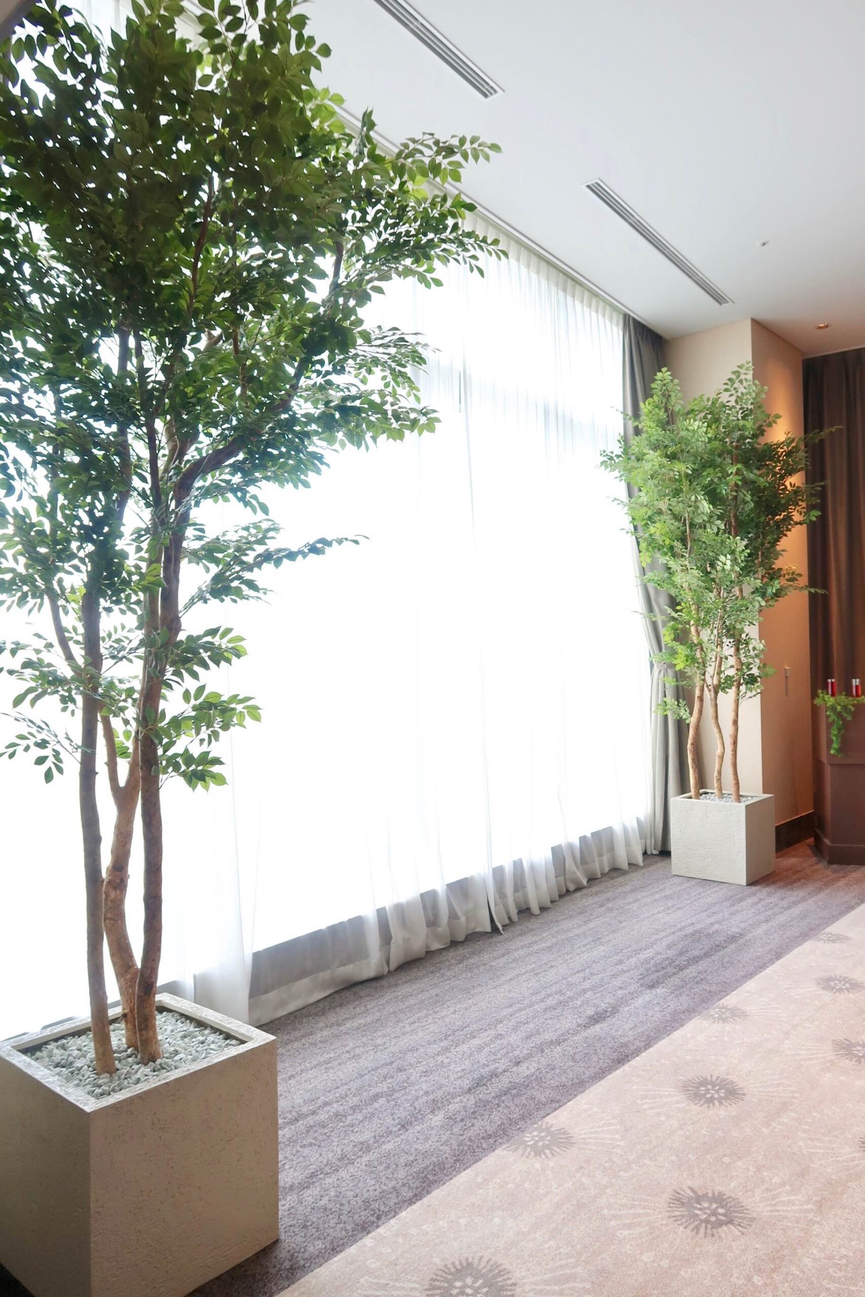 館内人工樹木での緑化。高さ2mほどの生木から、手間のかからない人工樹木へと入れ替え、常にグリーンのある空間へ。