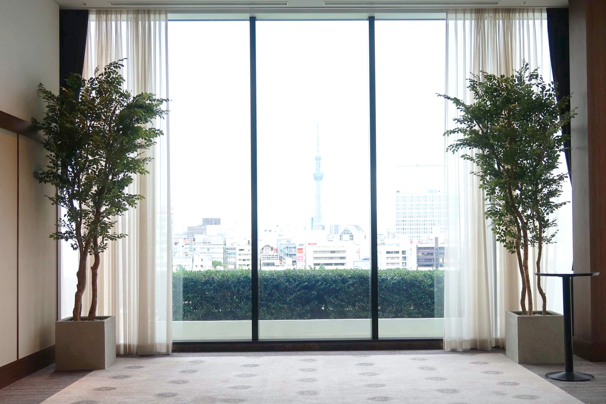 上野公園の緑から東京スカイツリー(R)を望む景色を引き立てる人工樹木。高さのある天井と一面の窓を生かし3mを超える高さの人工樹木を左右にレイアウト。東京スカイツリーを囲むアーチを描くように、左右セットをオーダーメイドでお作りしました。